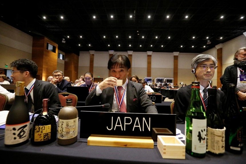 Naturalmente, os representantes japoneses numa reunião da Unesco no Paraguai assinalaram a ocasião com uma amostra de saquê.
