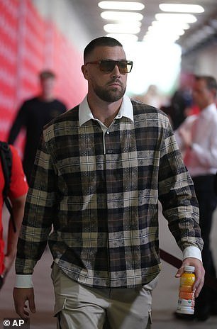 Alguns fãs brincaram que Kelce, que usava camisa xadrez de flanela e calça bege, estava vestido como um ‘lenhador’ – uma possível referência à música ‘Wood’.
