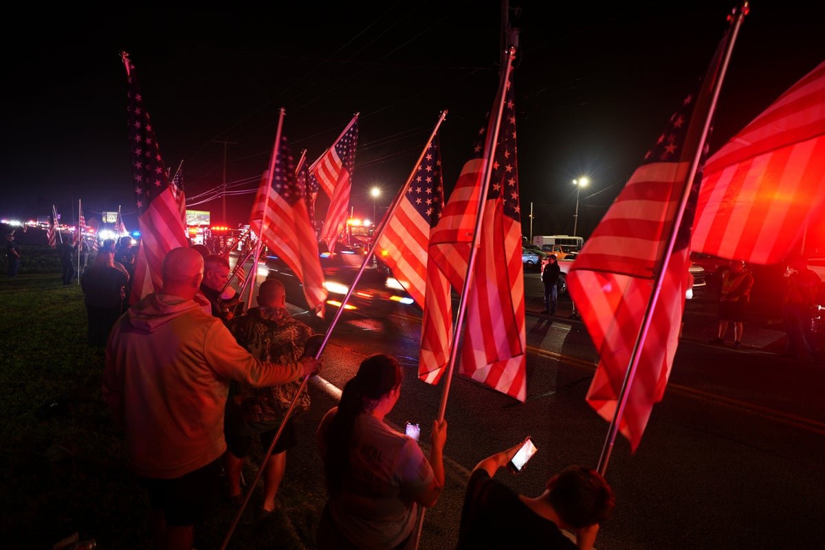 Horas após o tiroteio, os membros da comunidade mantiveram a bandeira americana para saudar um veículo de emergência no escritório do médico legista.