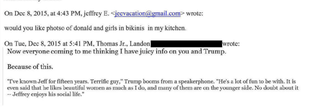 Num e-mail de dezembro de 2015, Epstein perguntou a um repórter: “Você quer (fotos) de Donald e garotas de biquíni na minha cozinha”.