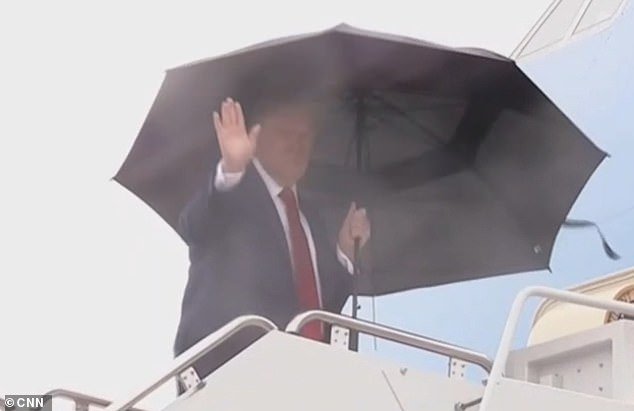 Trump se dirige aos repórteres pouco antes de embarcar no Força Aérea Um na Base Conjunta de Andrews Maryland Enquanto ele estava sob um guarda-chuva que balançava com o vento forte. Então, assim que embarcou no avião, ele apertou a mão e se despediu.