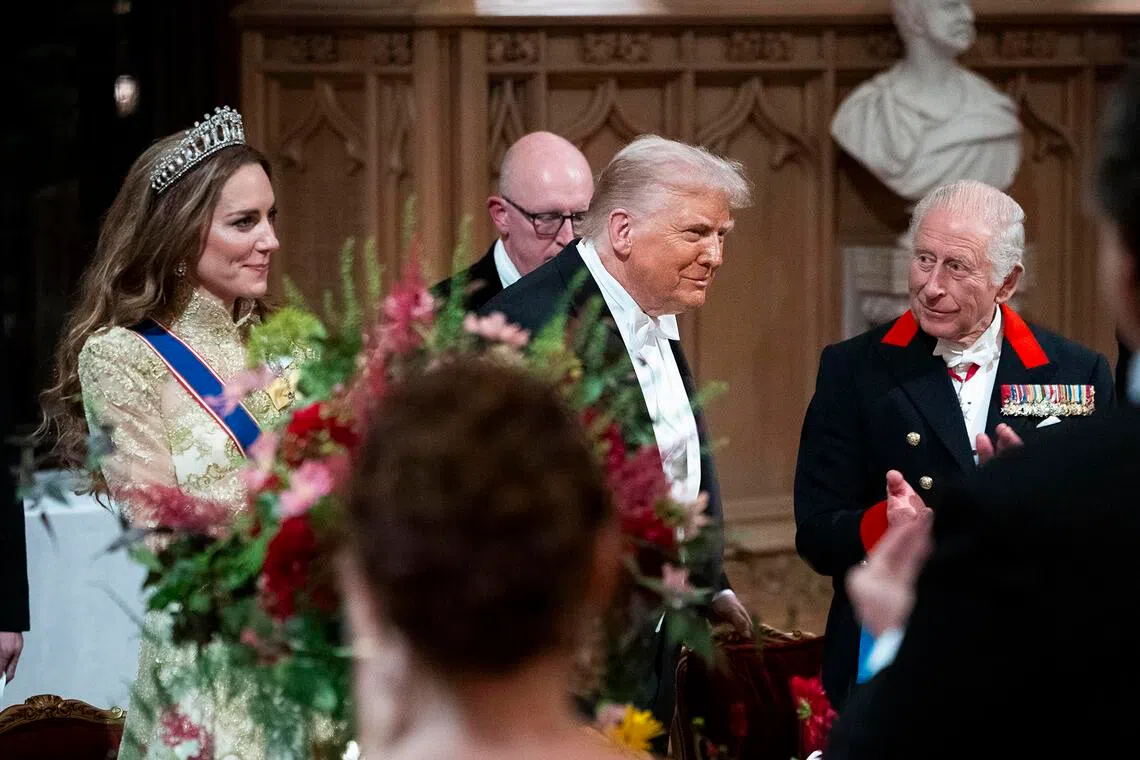 Em 17 de setembro, durante um banquete estadual no Castelo de Windsor, a princesa Wales (à esquerda), o presidente Donald Trump e o rei Charles da Inglaterra.