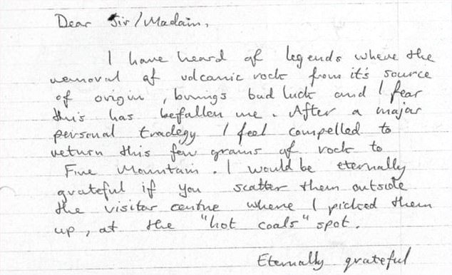 Numa carta manuscrita enviada ao parque nacional e recentemente divulgada pela instituição, o turista explicou que, depois de sofrer «uma grave tragédia pessoal», sentiu-se obrigado a devolver as pedras vulcânicas.