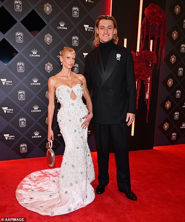 O zagueiro -chefe de Collingwood participou AFLNoite à noite com ela Triple J. O Radio Star Partner na segunda -feira, que virou a cabeça em um vestido de catáutores, que incluía lantejoulas complexas de miçangas, cintilantes e enfeites florais texcharged.
