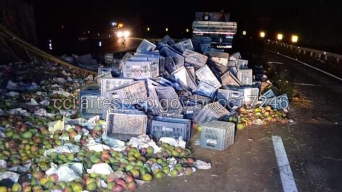 Caminhão que transportava 28 toneladas de mangas tombou frutas após capotar na rodovia Marília (SP) Artesp/Divulgação Uma carreta transportando 28 toneladas de mangas tombou no km 346 da Rodovia Rachid Reyes (SP-333), Marília (SP) e a carga se espalhou por toda a estrada. O trecho foi totalmente revelado na madrugada desta segunda-feira (17). Segundo a Agência de Transportes do Estado de São Paulo (Artesop), o acidente foi registrado neste domingo (16) quando, para explicar a causa, o motorista da carreta perdeu o controle do veículo e capotou. 📲 Participe do canal g1 de Bauru e Marília no WhatsApp. Quando caiu, a carga se espalhou pelo canteiro central e pela pista 1 dos dois lados da rodovia SP-333. Segundo a Artespe, o motorista sofreu ferimentos leves e a limpeza completa do local só foi concluída à tarde porque, apesar da carga ter sido movimentada, ainda havia frutas no local. O motorista sofreu ferimentos leves e causa do acidente será investigada Caminhão carregado com 28 toneladas de mangas derrama frutas em rodovia de Marília (SP) Artesp/Disclosur Veja abaixo os vídeos mais vistos no G1: Veja vídeos que estão em alta no G1 Veja mais notícias da região no G1 e veja a reportagem de Marília Bourdieu:
