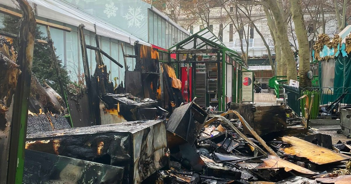 O departamento postou fotos das consequências do incêndio, mostrando quiosques danificados e pilhas de destroços carbonizados.