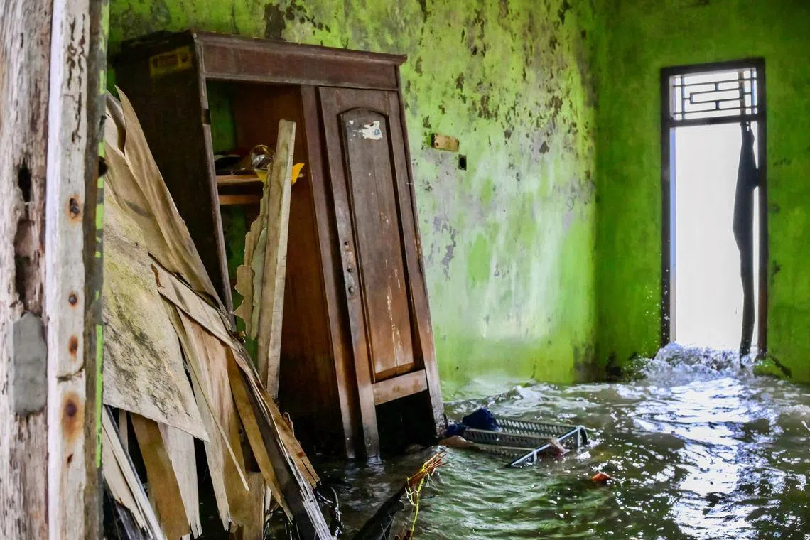 O interior de uma casa abandonada e parcialmente submersa, perdeu para as marés em ascensão devido às mudanças climáticas, na vila de Semonet, em Pekalongan, Java Central.
