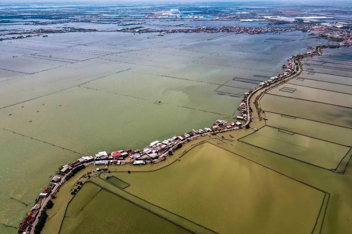 Uma vista aérea de casas parcialmente submersas devido à perda de terra das mudanças climáticas em Bedono Village, em DeMak, Central Java.