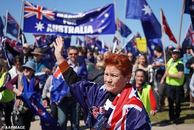 Uma nova pesquisa revela que 58 por cento dos australianos apoiam cortes no subsídio de imigração, incluindo 77 por cento dos eleitores do partido One Nation de Pauline Hanson (na foto, o senador Hanson em um comício anti-imigração em massa em agosto)