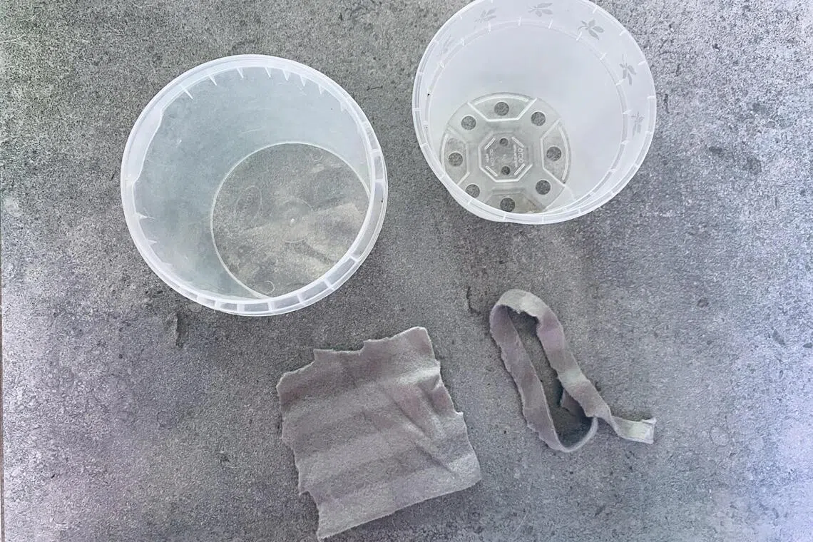 Invente seu próprio recipiente autopreenchível usando materiais reciclados. (No sentido horário, a partir do canto superior esquerdo) Use um recipiente de plástico para alimentos como tanque externo de água, um vaso interno de plástico comum para flores que caiba na boca do vaso externo, uma tira de poliéster para servir de pavio e um pedaço de pano de poliéster para cobrir o orifício de drenagem do vaso interno.