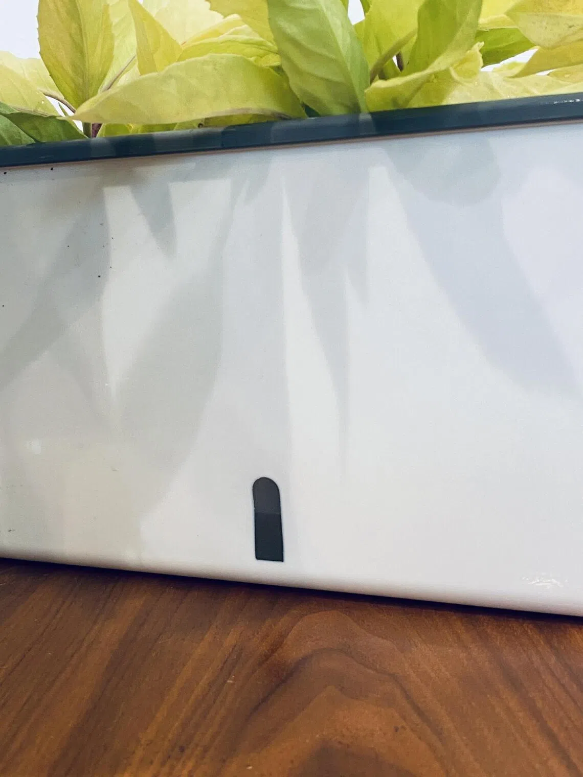 Janela no recipiente externo da calha da plantadeira que permite verificar a quantidade de água restante no reservatório de água.