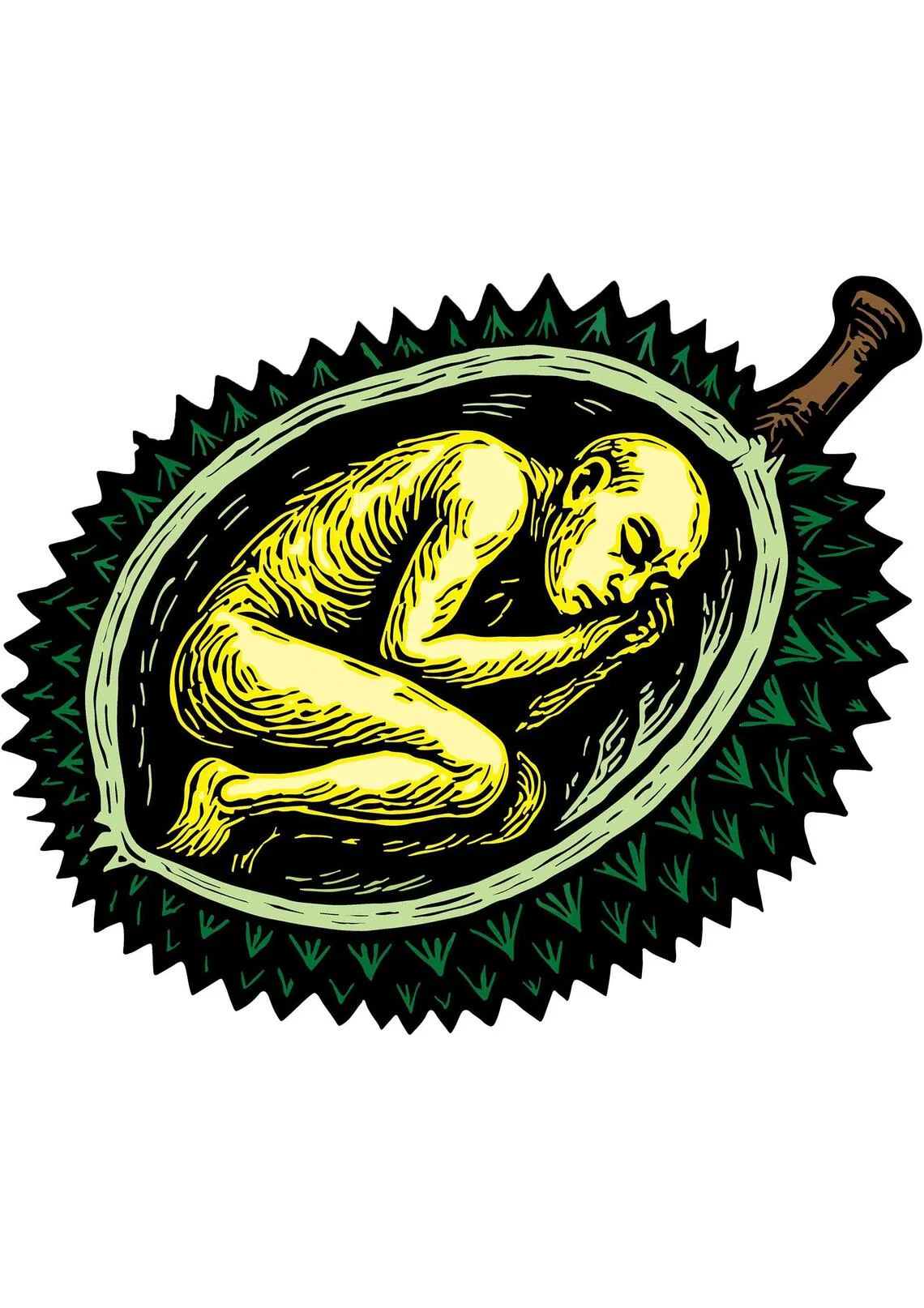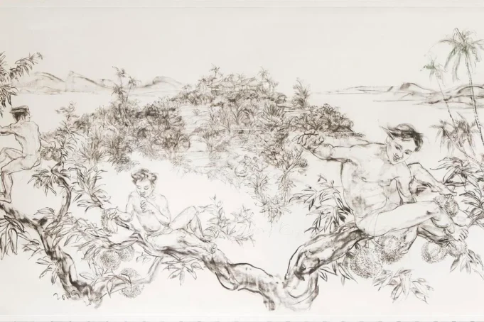 Confira ‘Musang Kings’ do artista Jimmy Ong. Esta obra retrata um homem nu brincando em um bosque de durian semelhante ao Jardim do Éden em um estilo de carvão instantaneamente reconhecível. Observe também como a composição reflete o formato da ilha de Cingapura.
