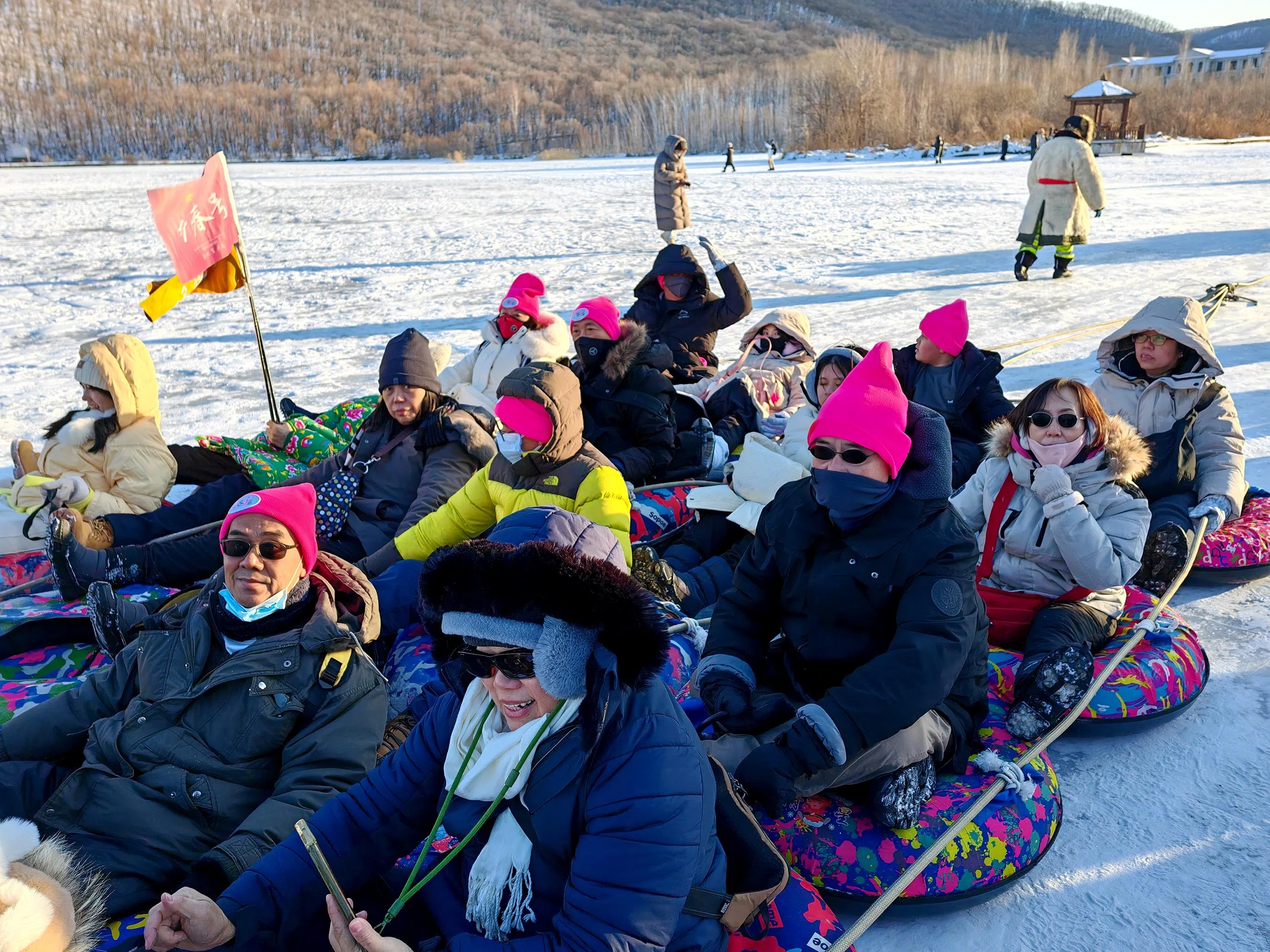 As atividades de inverno no nordeste da China incluem trenós, esqui e pesca no gelo.