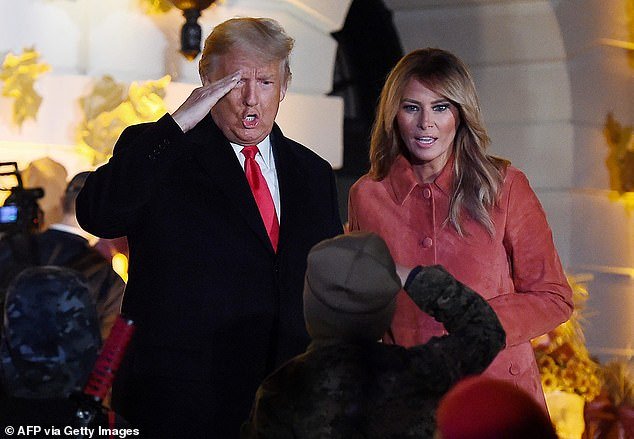 O presidente Donald Trump, acompanhado pela primeira-dama Melania Trump, coloca uma barra de chocolate sobre a cabeça de uma criança vestida de Minion durante um evento de doces ou travessuras de Halloween no gramado sul da Casa Branca, decorado para o Halloween, segunda-feira, 28 de outubro de 2019
